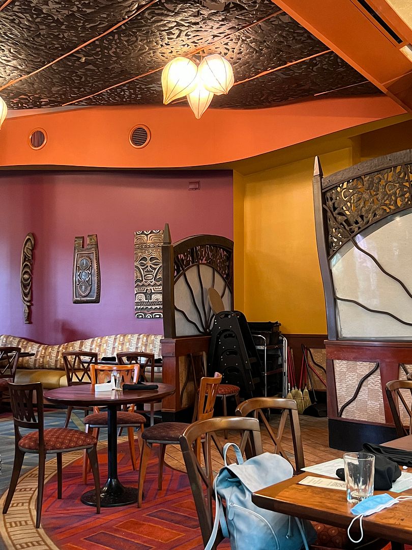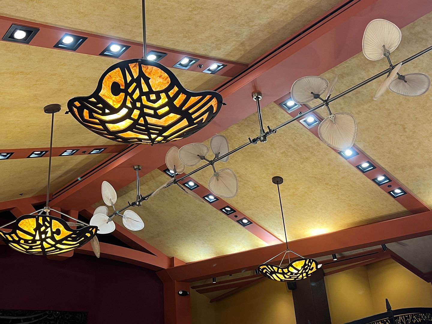 I like the tropical island theming/decor of this restaurant, especially the lighting and ceiling fans…