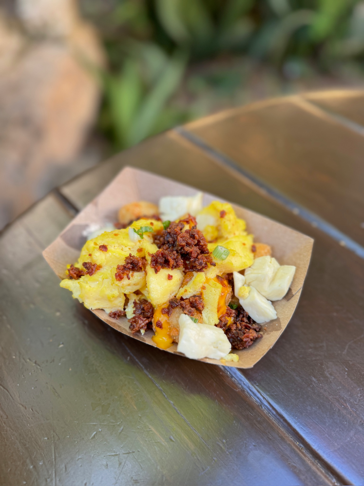 Breakfast Totchos – Potato Barrels, Scrambled Eggs, Nacho Cheese, Cheese Curds, and Crumbled Bacon – $10.79 (price as of February 2025 is $10.99)