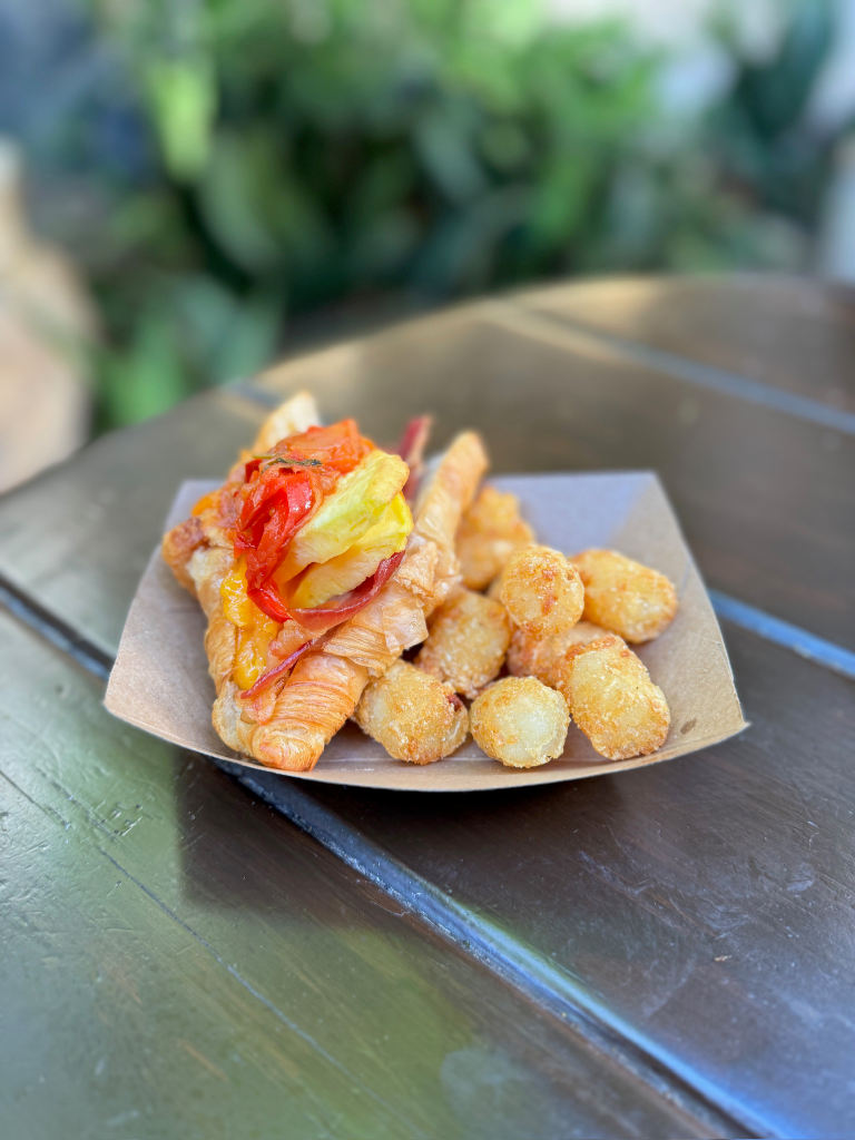 Egg and Bacon Croissant Sandwich – Croissant with a Cheese Omelet, Crispy Bacon, and Tomato-Pepper Relish served with Potato Barrels – $6.99 (price as of February 2025 is $8.99, a $2.00 increase)