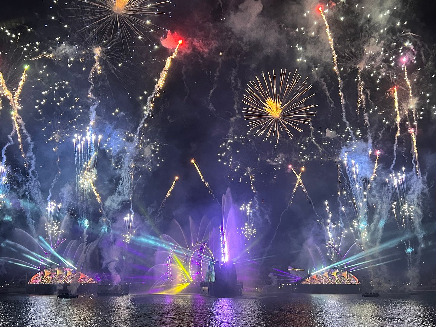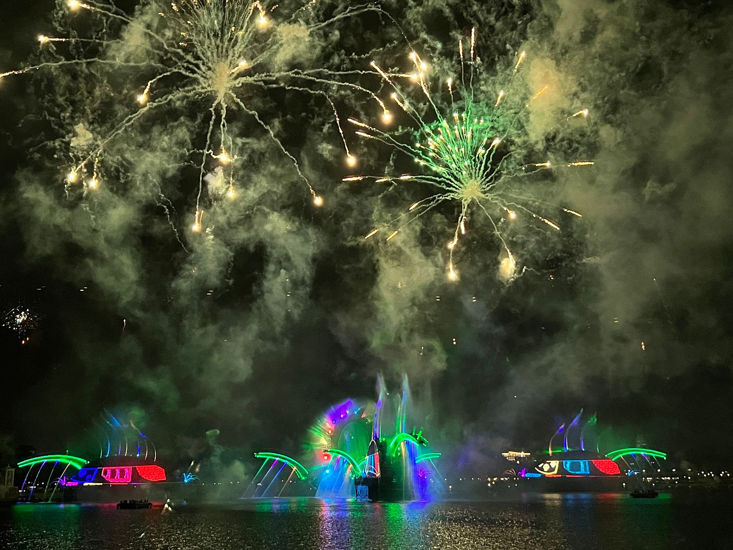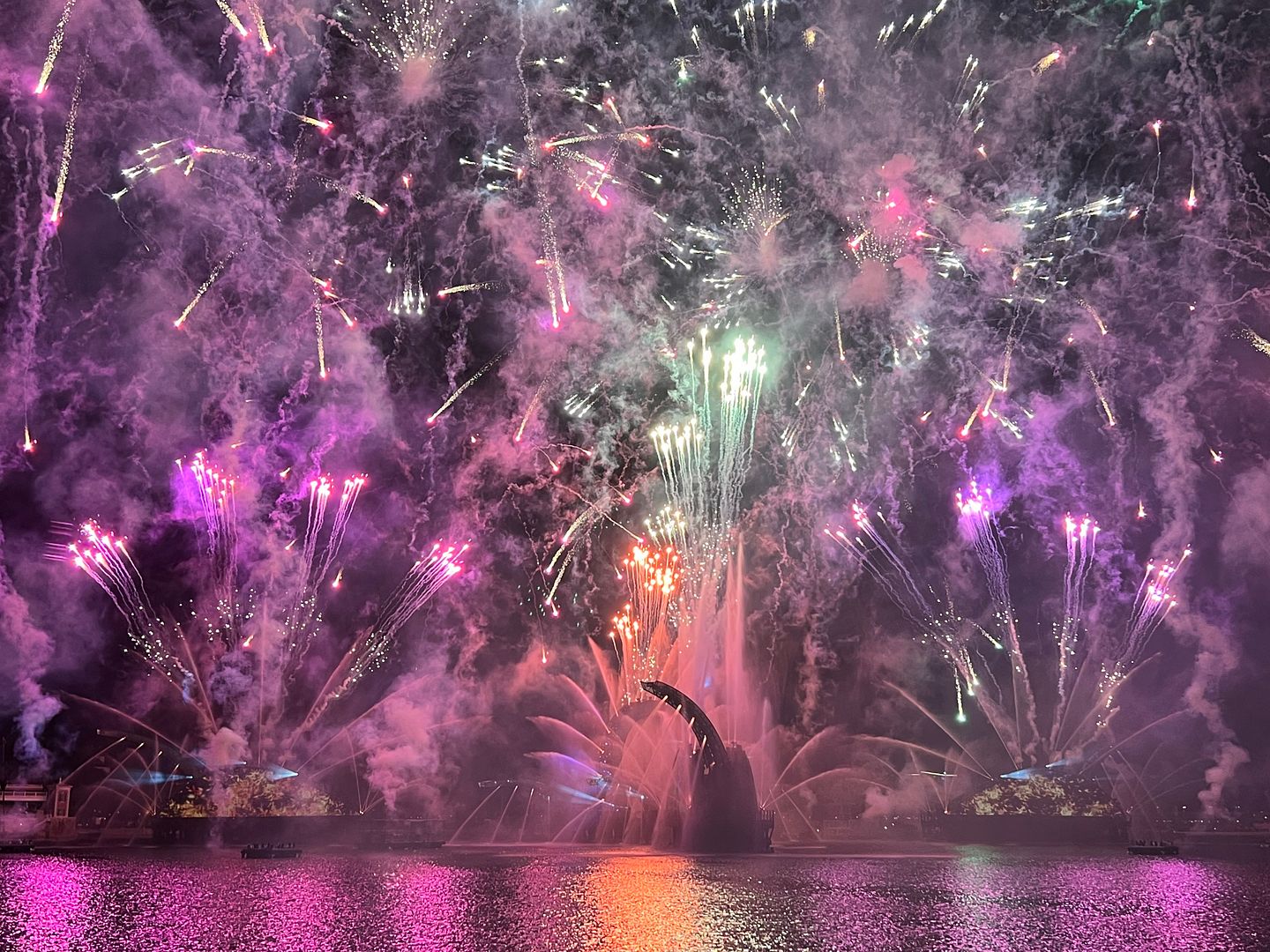 At 9:45 the fireworks show (Harmonious) began. Here are some photos I took from our table through the glass window…