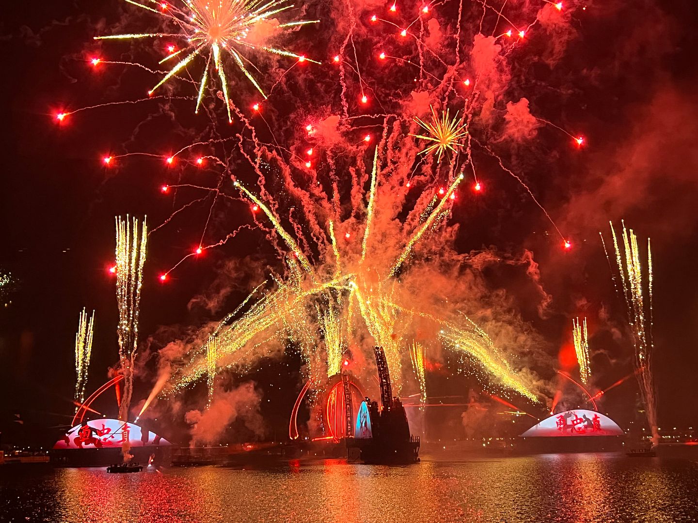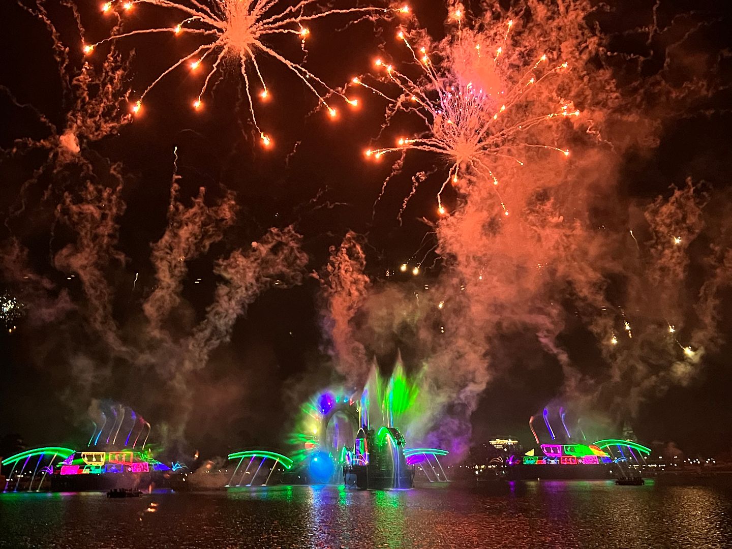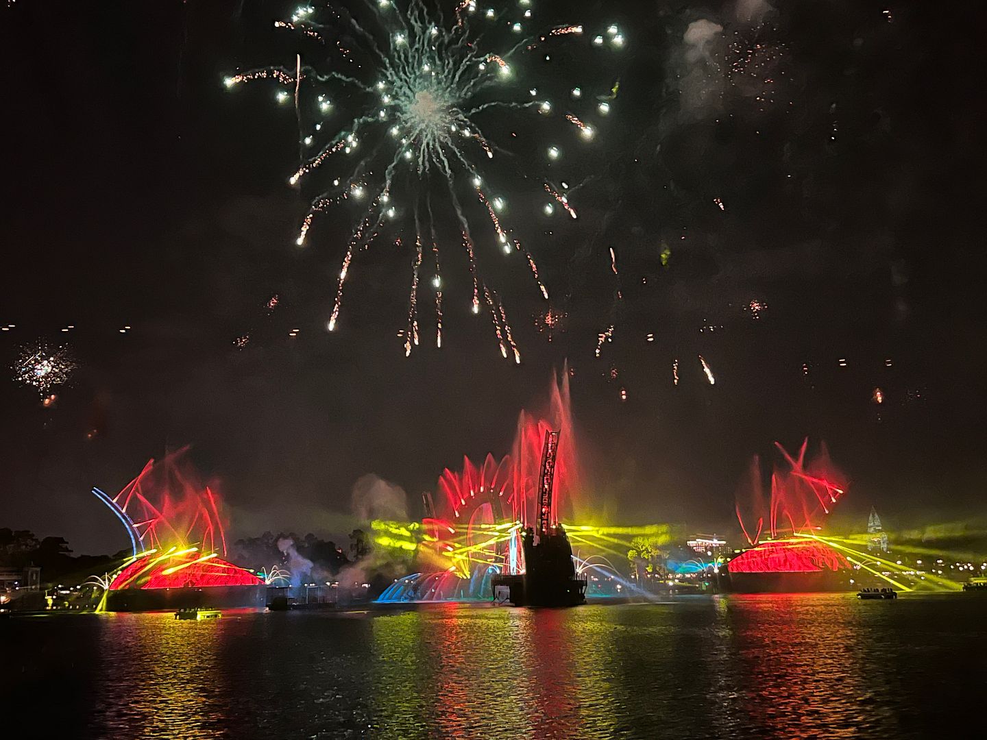 At 9:45 the fireworks show (Harmonious) began. Here are some photos I took from our table through the glass window…