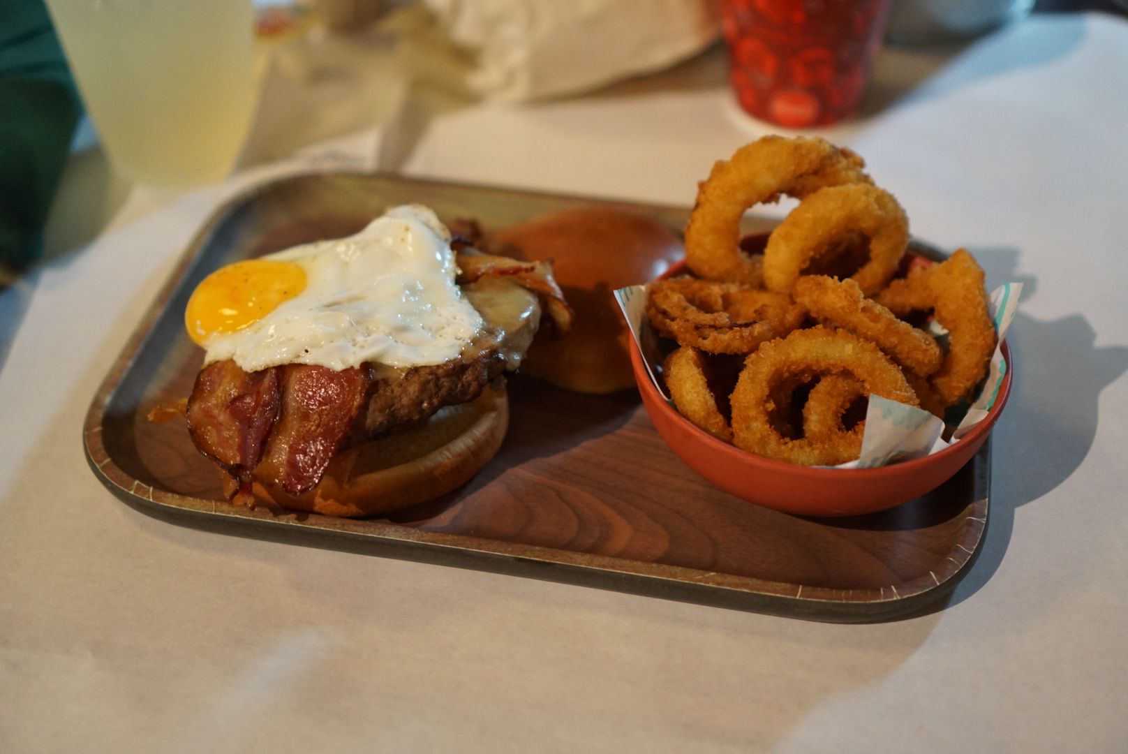 He went with the Sunny-side Up Burger and Onion Rings for his side. The burger was topped with a slice of Swiss cheese, 2 large slices of crispy bacon and a fried egg cooked sunny-side up. It was a bit of a struggle to keep the soft yolk of the egg intact and on his burger long enough to take photos. But other than this minor problem, he really enjoyed his burger. The onion rings, which we shared, were thick and crispy and very good.