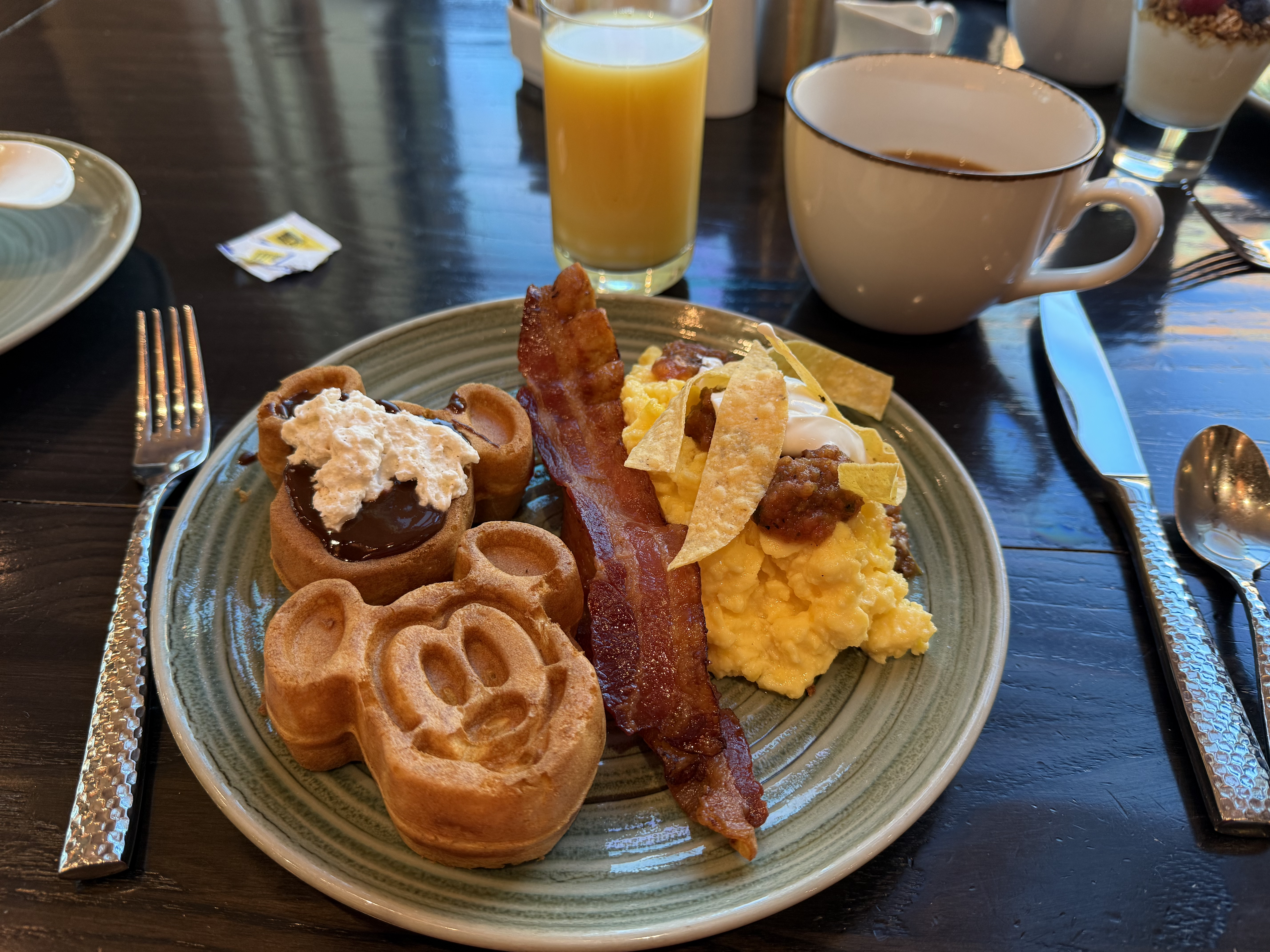 Then for an additional $8.00 I could have anything from the Continental section of their buffet plus their Hot Selections area, which had Bacon, Pork Sausage, Chorizo Sausage, and Ranch-Style Potatoes. Also there were Scrambled Eggs with toppings (fresh salsa, lime crema, and crispy tortilla strips) and Pancakes & Mickey Waffles with toppings (cinnamon whipped cream and Mexican chocolate ganache) in this section. I didn’t take any photos of this area because it was manned by a server who plated your selections for you. This made it a little awkward for me to take photos.