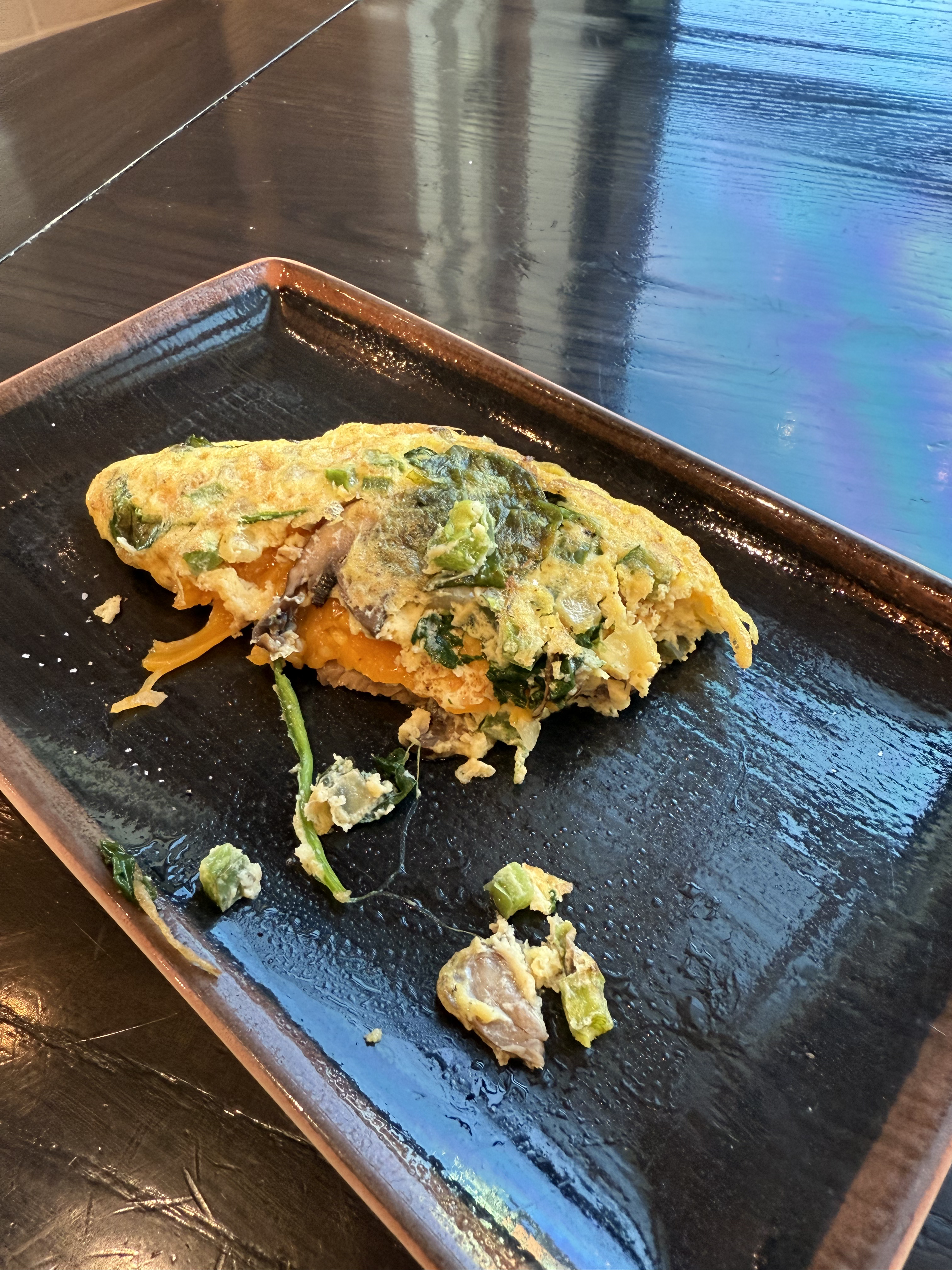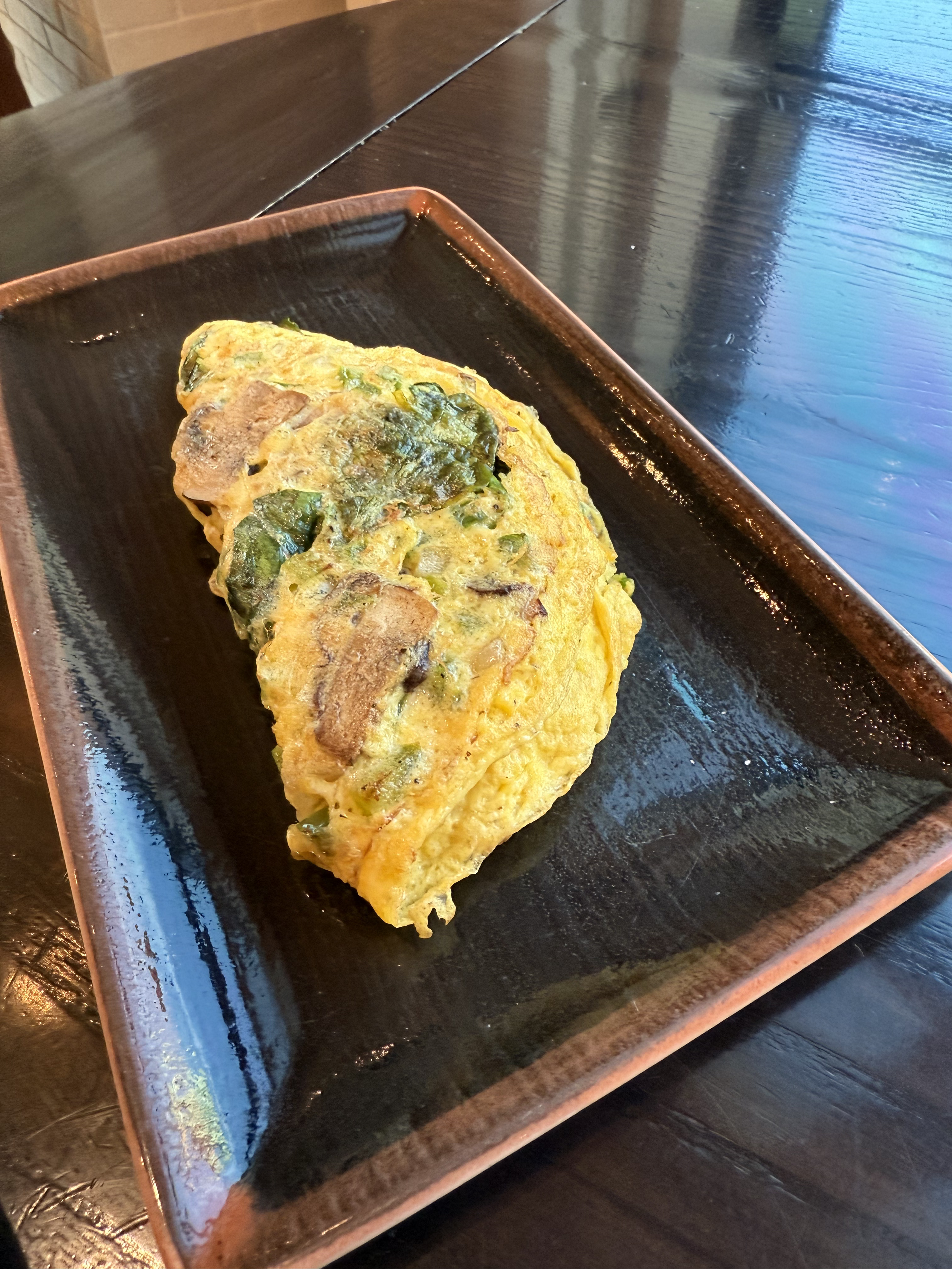 I failed to write in my notes what veggies were included but I know it had mushrooms and spinach and I think also green peppers and onion. Also there was lots of cheddar cheese…
