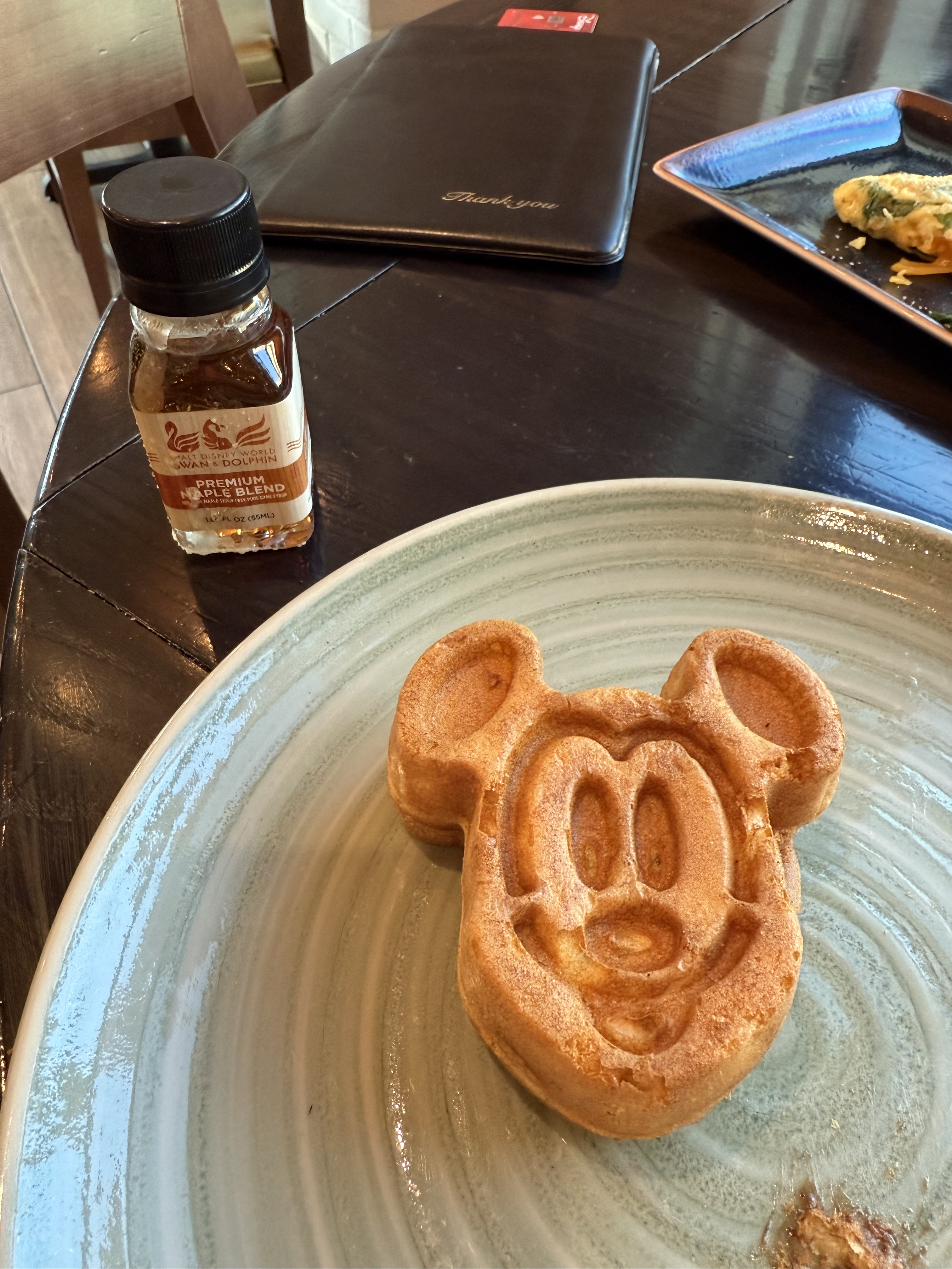 As you can see I got two Mickey waffles so that I could try one topped with the Mexican chocolate sauce and cinnamon whipped cream while topping the other one with just maple syrup (which they served in individual-size bottles)…