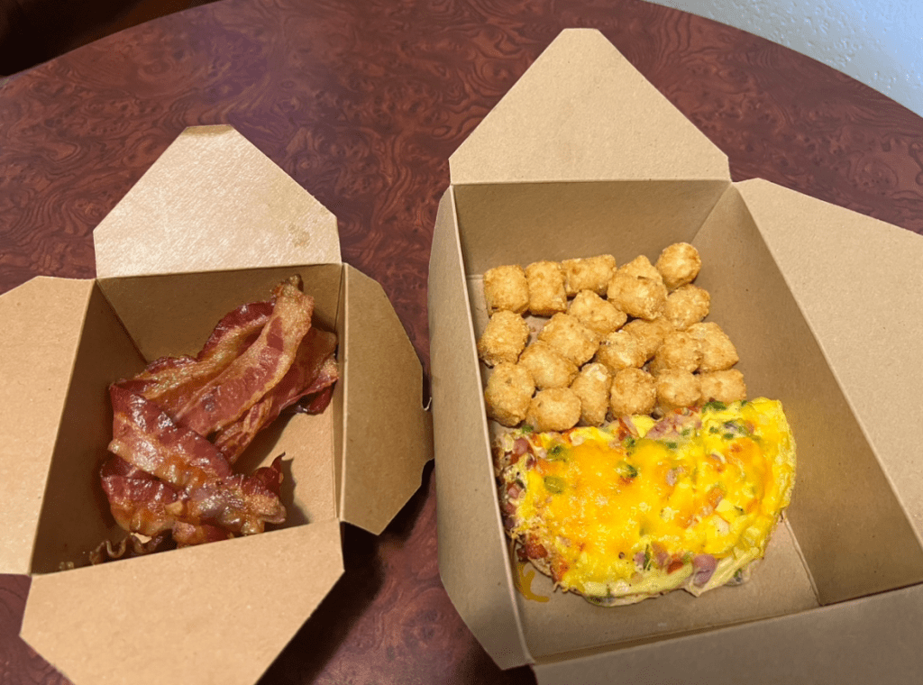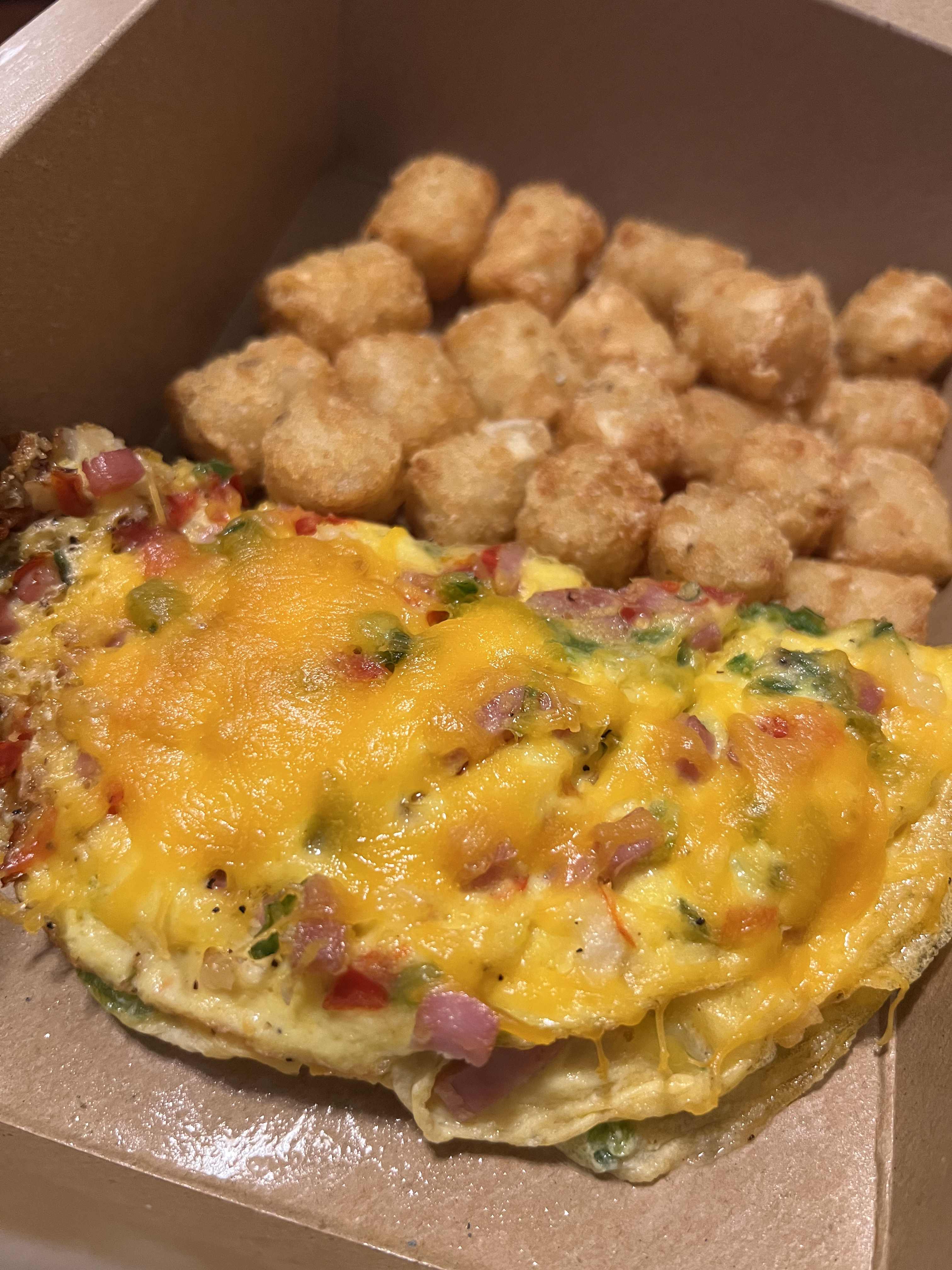 Western Omelet with Ham, Bell Peppers, Onions, and Cheddar served with Potato Barrels (aka Tatter Tots) – $10.99