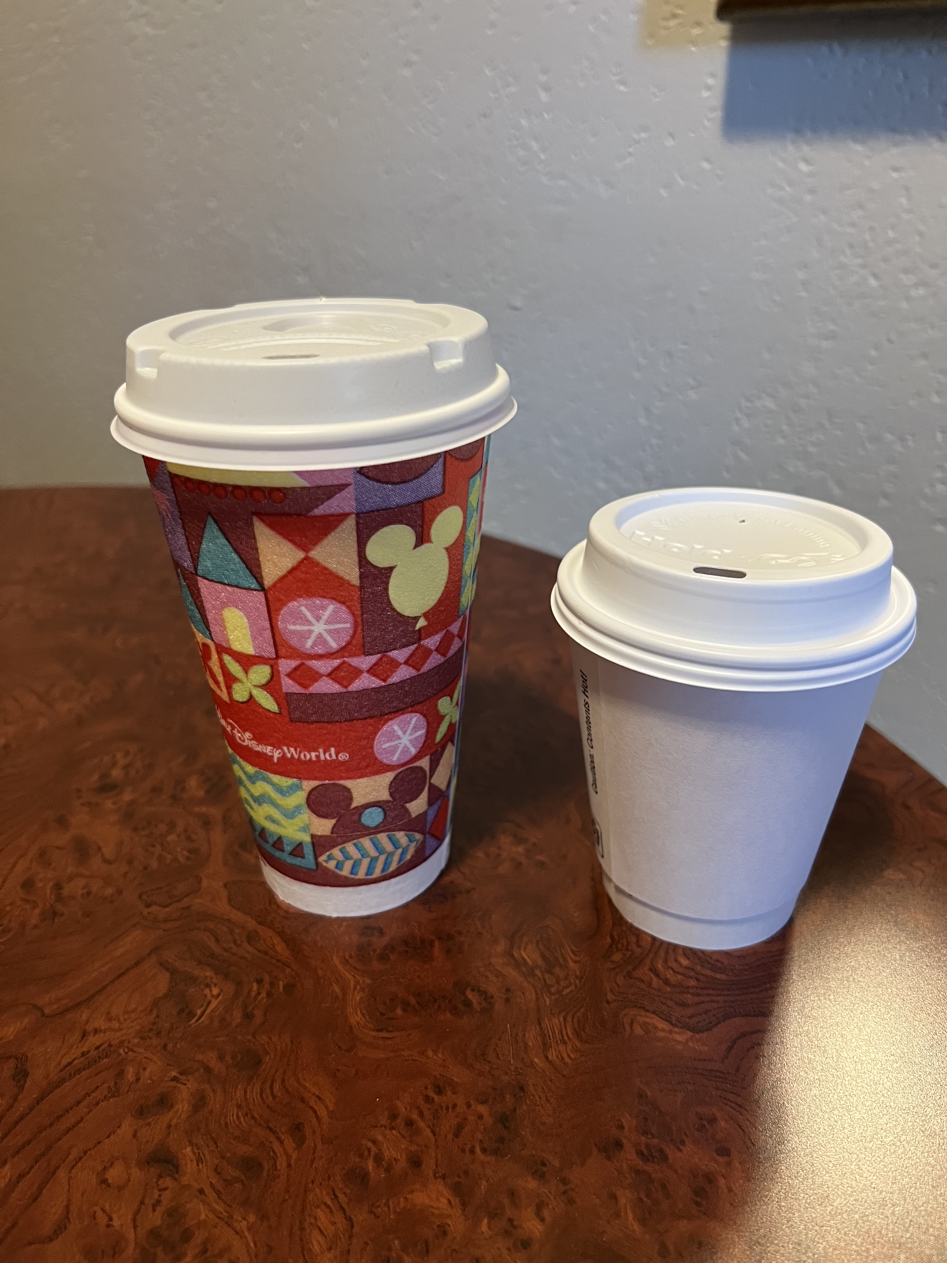 My coffee (pictured on the right) was a small Latte, with the emphasis on “small”. This small Latte was $4.49, which I initially thought was overpriced until I learned that Starbucks charges $4.85 for a similar size Latte, and that’s at a local Starbucks not at Disney. So I guess, in hindsight this was a bargain?? But anyway, this was just your average Latte and I gave it a rating of 3.
