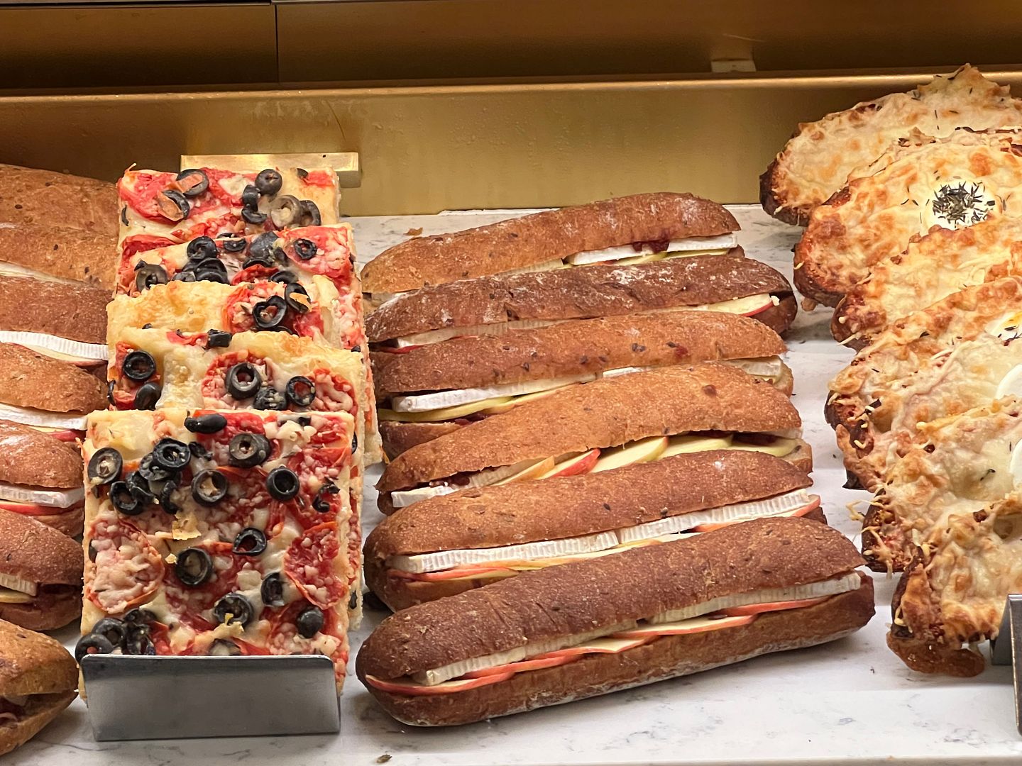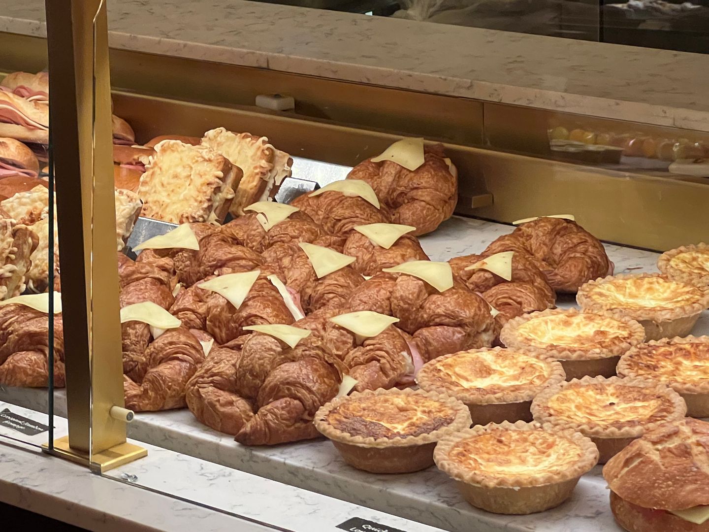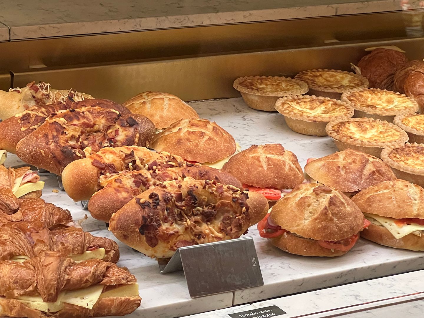 From left to right: Ham & Cheese Croissants, Bacon & Cheese Rolls, Poulet an Pistou Sandwiches (Chicken breast, Cheese, Tomato Red Onion and Pesto), and Quiche Lorraine