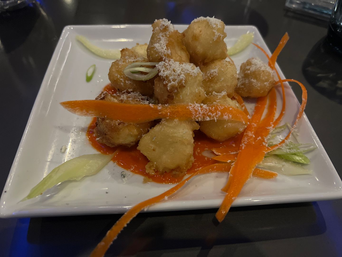 Blue Moon Cauliflower – Tempura Fried Cauliflower, House-made Hot Sauce, and Blue Cheese Dust (Vegan)