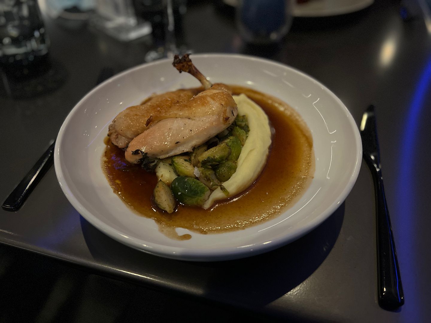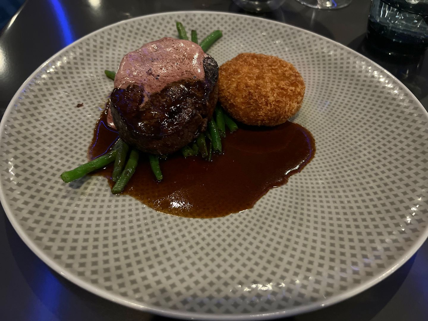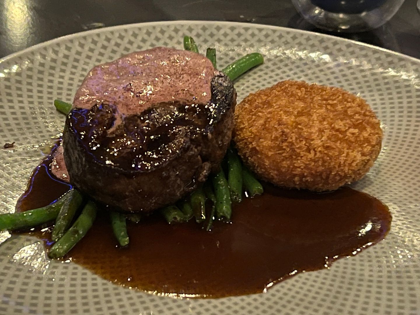 I ordered this medium and I think it was properly cooked this time, although the lighting here made it a little difficult to tell for sure. While the filet was tender, it could have used more seasoning. The cabernet butter was a weird pink color and didn’t look particularly appetizing on top of the filet. It also didn’t seem to add much flavor. I liked the potato leek croquette. It reminded me of a potato pancake. The haricots verts were just green beans. Overall I rated my entrée a 3 1/2.