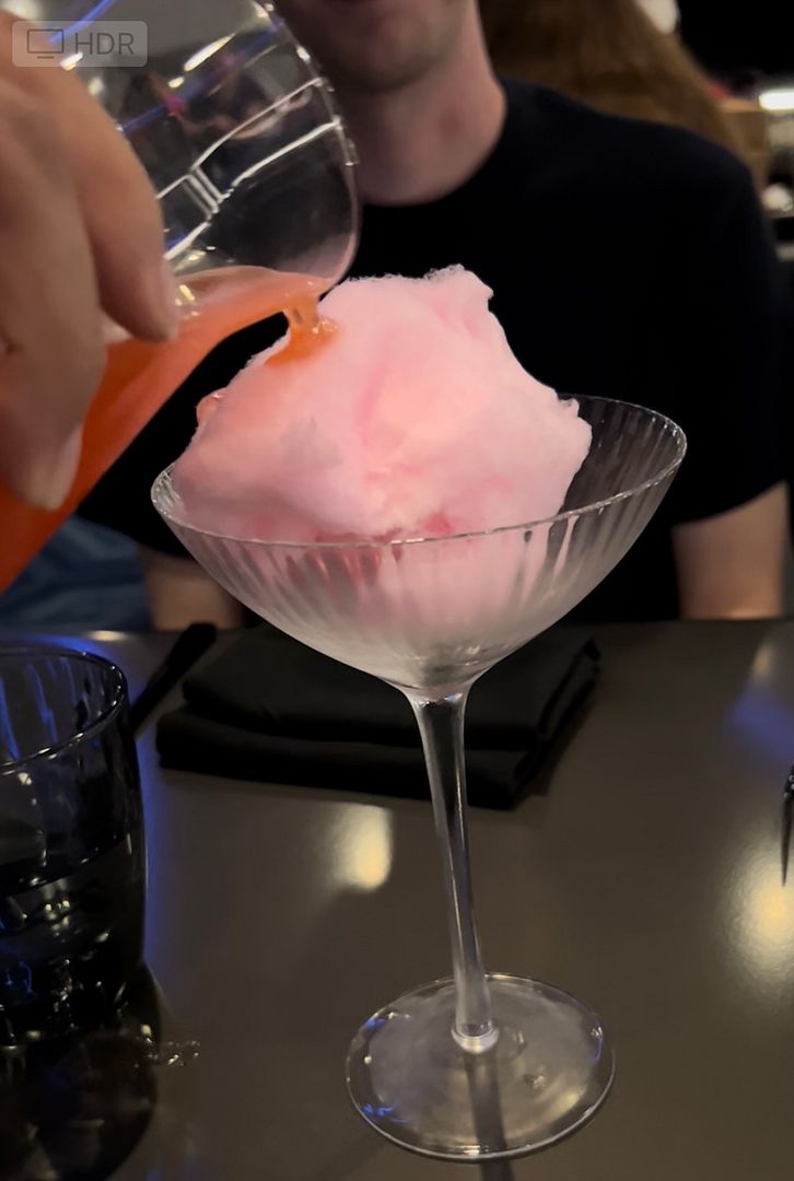Now on to our cocktails, which we ordered at an additional cost. First up is Andrew’s choice, which arrived looking like a glass of pink cotton candy…