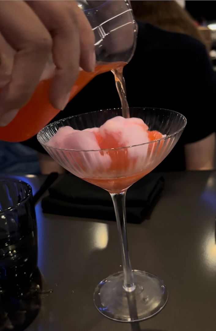 This was called an Atmospritz. The ingredients were listed as New Amsterdam Vodka, Aperol, Monin Blood Orange, Orange Juice, Prosecco, and Cotton Candy Cloud. The price was $15.00. This cocktail is not listed on the current Feb. 2024 Space 220 cocktail menu.