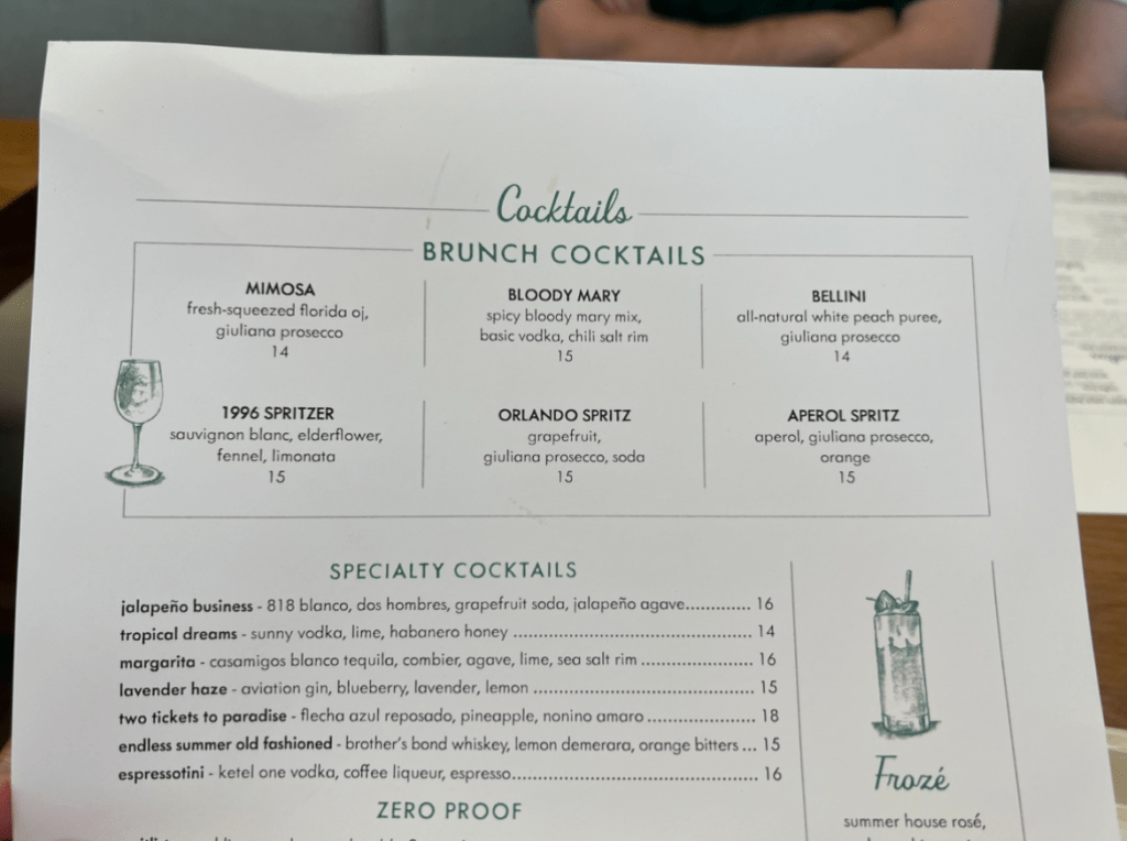 And speaking of the bar, here is a photo of their Brunch Cocktail menu which three of us ordered from…