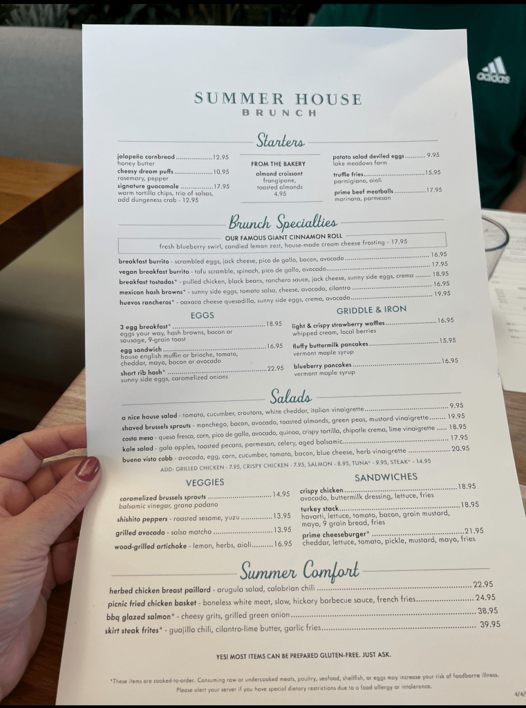 With 3 of our group already on their flight home to Chicago, that left 4 of us for our 11:45 brunch at Summer House on the Lake at Disney Springs. Summer House opened its 4th location (with the other three being in Chicago, Las Vegas and North Bethesda, Maryland) at Disney Springs in December 2023, so was still fairly new when we visited for brunch in early April 2024.