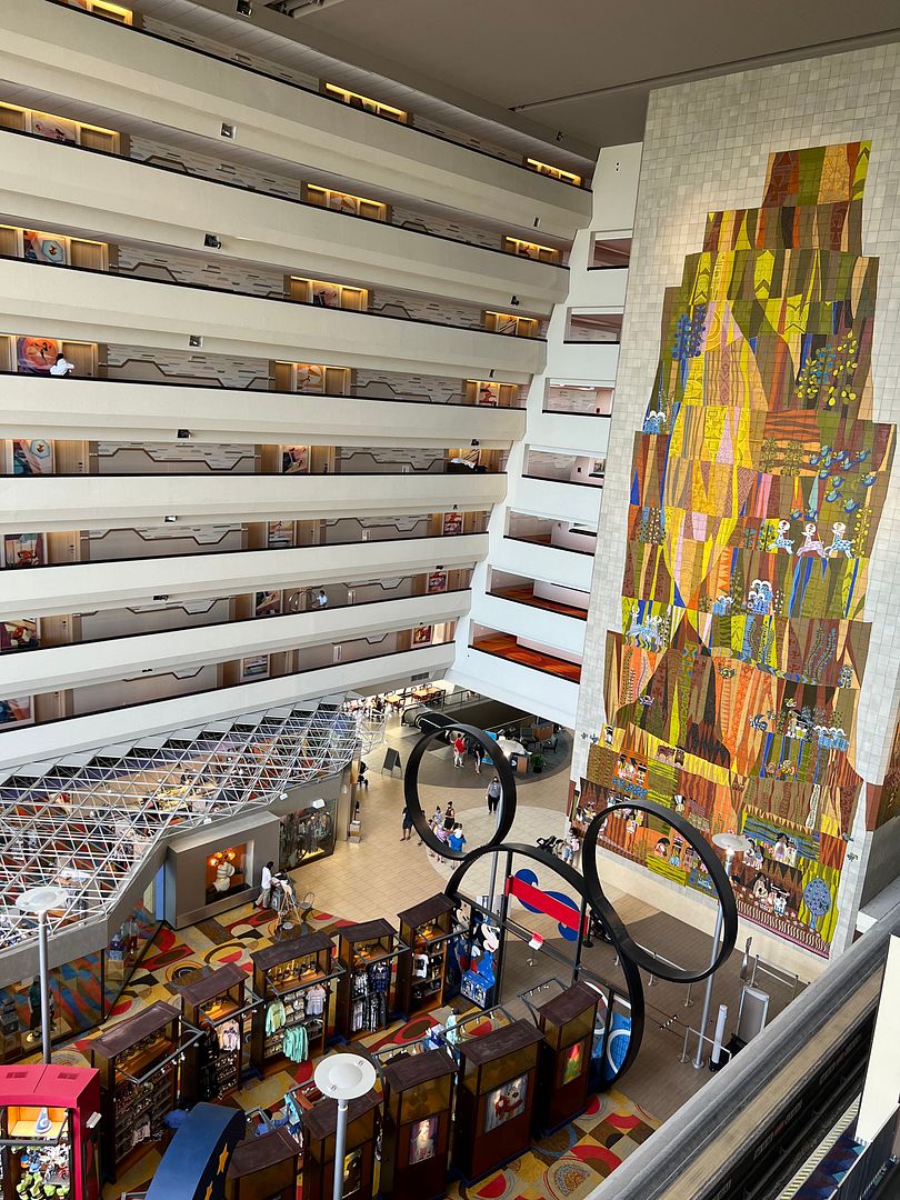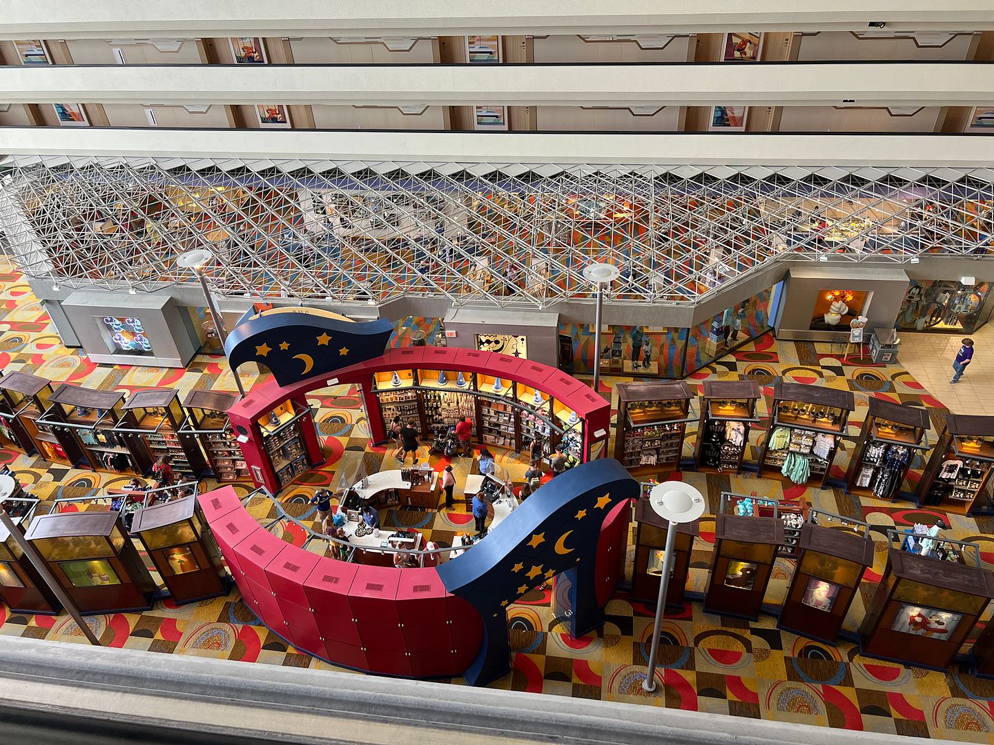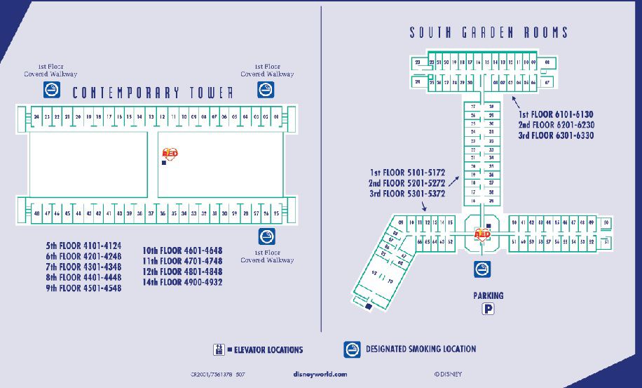 So the Main Tower A-frame building of the Contemporary Resort has 14 stories, but because there is no 13th floor, the top is Floor #15. The lobby, the relatively new restaurant, Steakhouse 71, and Contemporary Grounds (the Joffrey’s coffee bar) are on the 1st floor and then the 2nd floor has the check-in desk for the resort’s signature restaurant, California Grill, located on the top floor. Once you check-in for your reservation you will be accompanied by a castmember in a special elevator which takes you up to the 15th floor restaurant. The lobby elevators only go up as far as the 11th floor unless you are a Club Level guest. To get to either of the Club Level floors (12th and 14th) you must touch your (Club Level) room key or Magic Band to the pad located just above the elevator buttons. But I digress, so now getting back to the 2nd floor. It is here that you will also find the Convention Center meeting rooms. Then the 3rd floor I believe has the Fitness Center as well as some administrative offices. The 4th floor (known as the Grand Canyon Concourse) is probably the resort’s busiest as it is here that you will find its quick service restaurant, Contempo Cafe, and the very popular character meal restaurant, Chef Mickey’s…