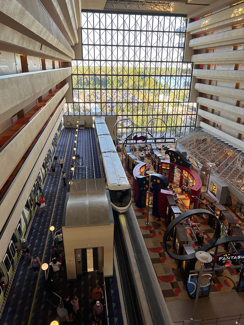 It is on the 4th floor that you also go through security and take the escalator or elevator up to the monorail platform…because, in case you didn’t know, the monorails actually go right through the hotel on one side of the 5th floor. The resort monorail (shown on the left below) stops there for guests to board before moving on to the Transportation and Ticket Center, the Polynesian, the Grand Floridian and then the Magic Kingdom to complete the loop.
