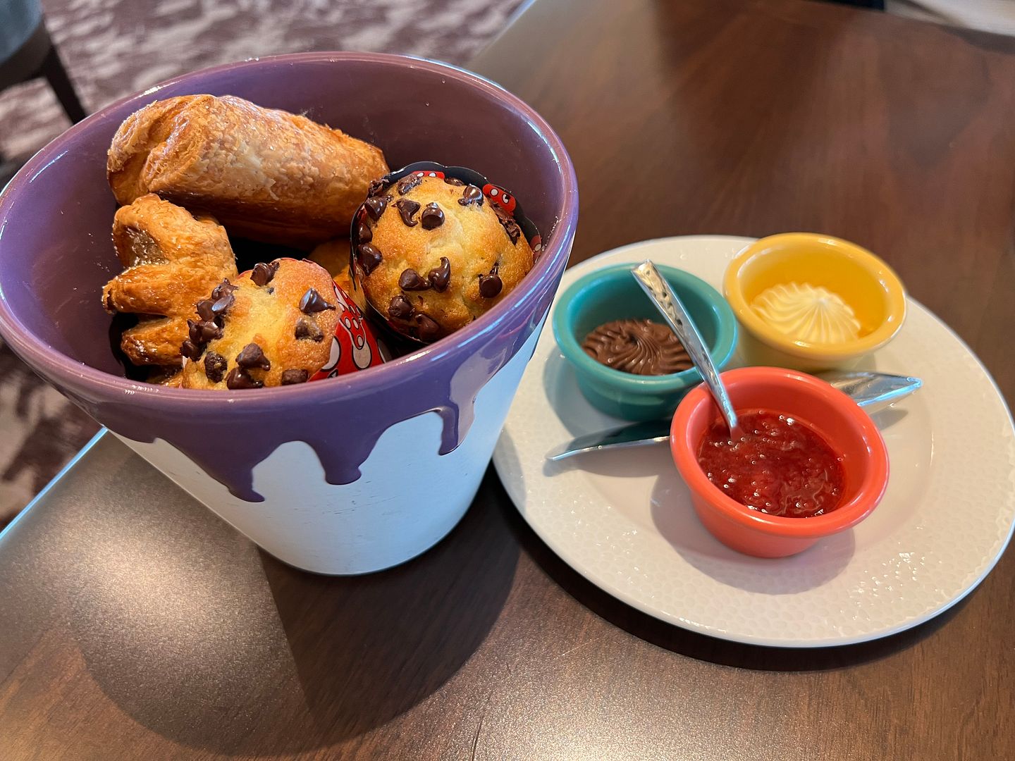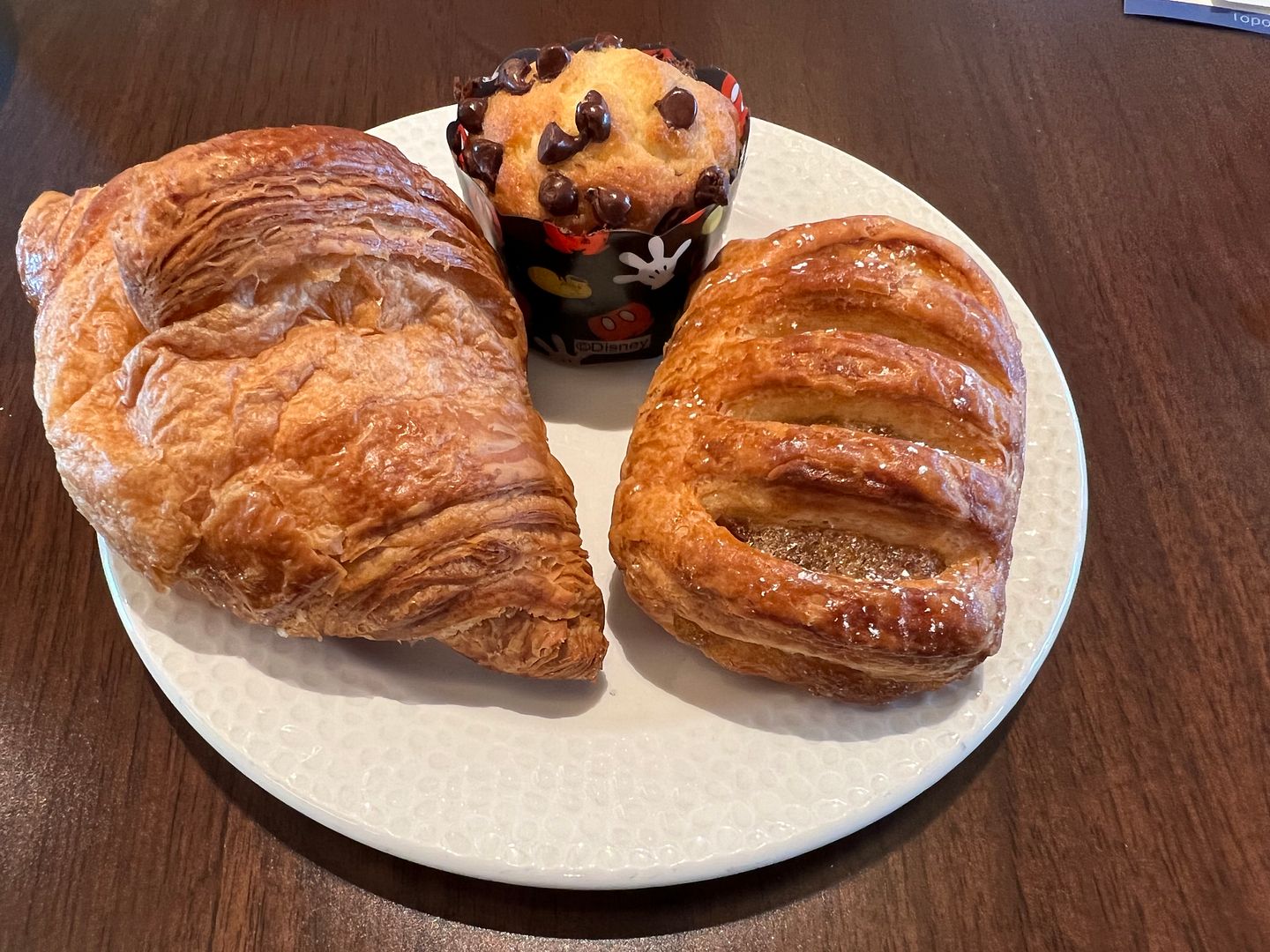 I didn’t try the plain croissant because I didn’t want to completely fill up before getting our entrees. The mini muffin (in the cute Mickey muffin cup) and the danish were both good though. I was expecting the danish to be fruit filled but it actually was filled with caramel, which was a nice surprise. We gave the pastries a rating of 4.