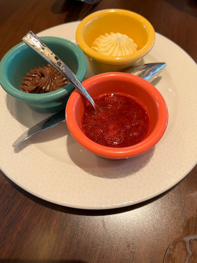 Honey Butter, Strawberry Jam and Nutella (or a whipped chocolate-hazelnut spread).