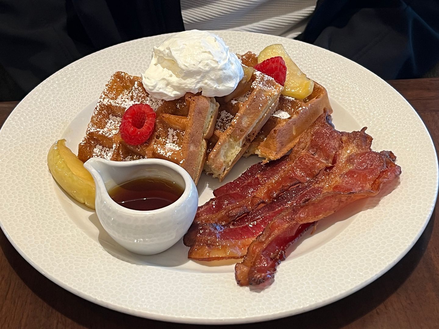 Sour Cream Waffles with Roasted Apples, Chantilly Cream, Orange-Maple Syrup, and with your choice of Bacon (Andrew’s choice), Ham, Sausage, or Plant-based Sausage