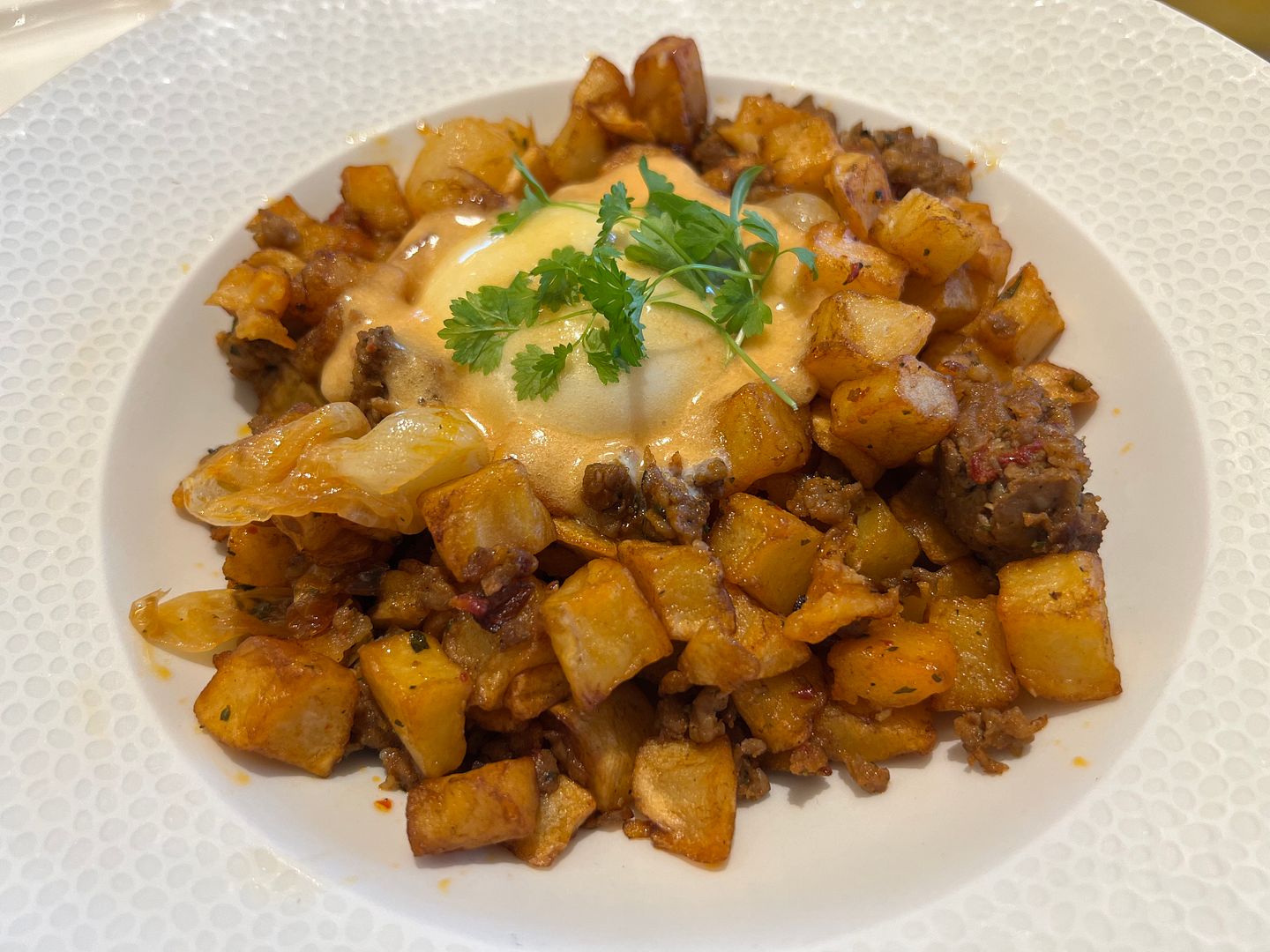 Note: While the Sour Cream Waffles and the Mickey Waffle Dippers are still on the current menu (as of Feb. 2024), my entrée choice, the Spiced Sausage Hash, is no longer available. Also I’ve read that you are now limited to ordering just one entrée per person.