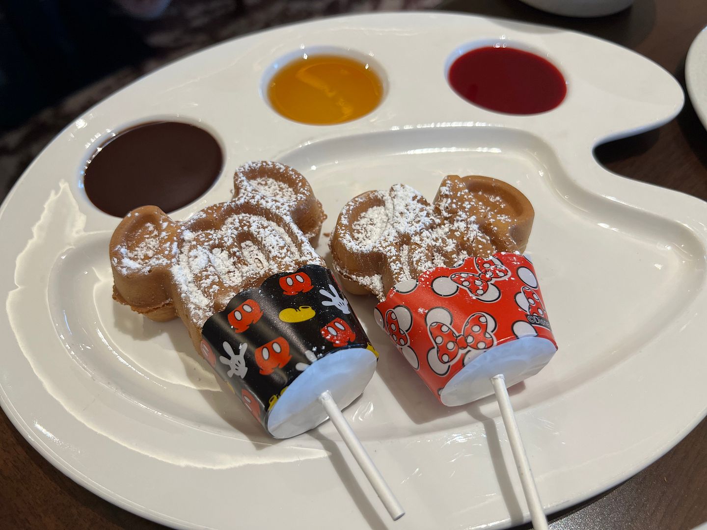 What an adorable presentation of Mickey waffles and so easy for kids to eat. They were served with three dipping sauces. from left to right they were Nutella sauce (chocolate-hazelnut), regular syrup, and strawberry sauce. My favorite was the Nutella sauce. Another 4 rating for the Mickey Waffle Dippers!