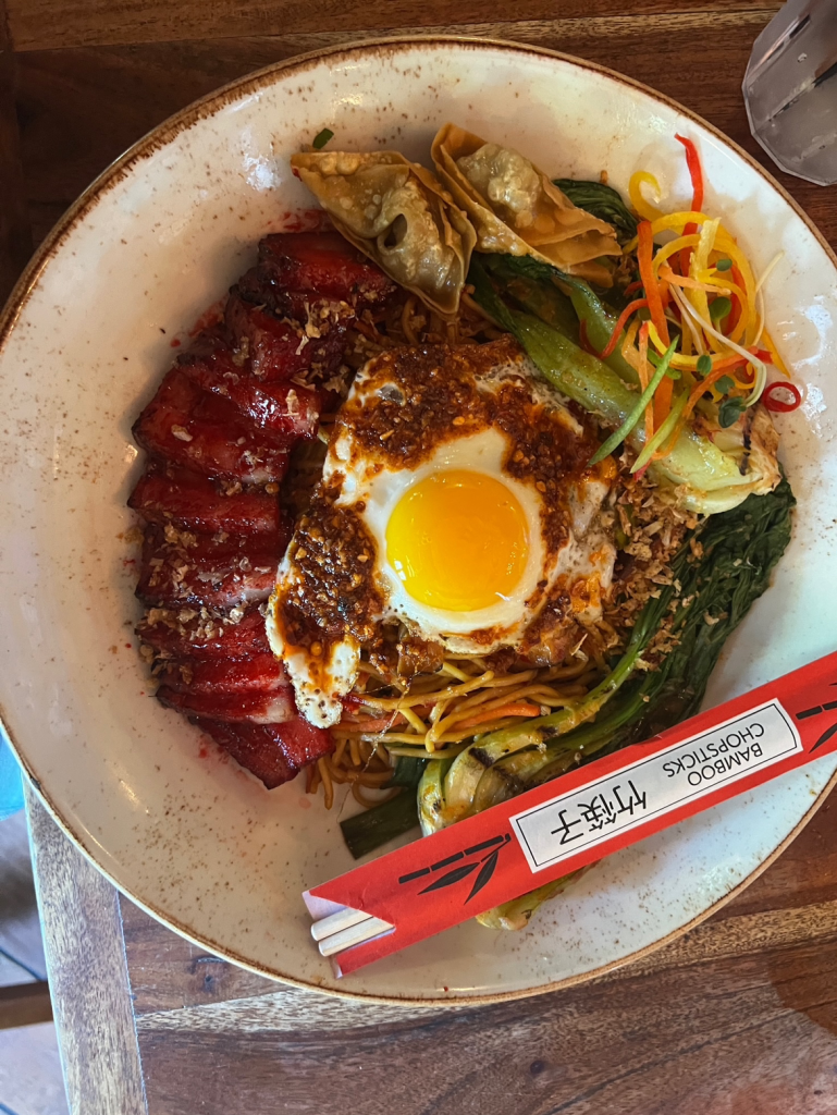 Cantonese Pork Belly Bowl – Char Siu Pork Belly, Stir-fried Yakisoba Noodles with Carrots, Shiitake Mushrooms & Scallions, Grilled Bok Choy, Crispy Pork Wontons, and a Fried Egg – $34.99