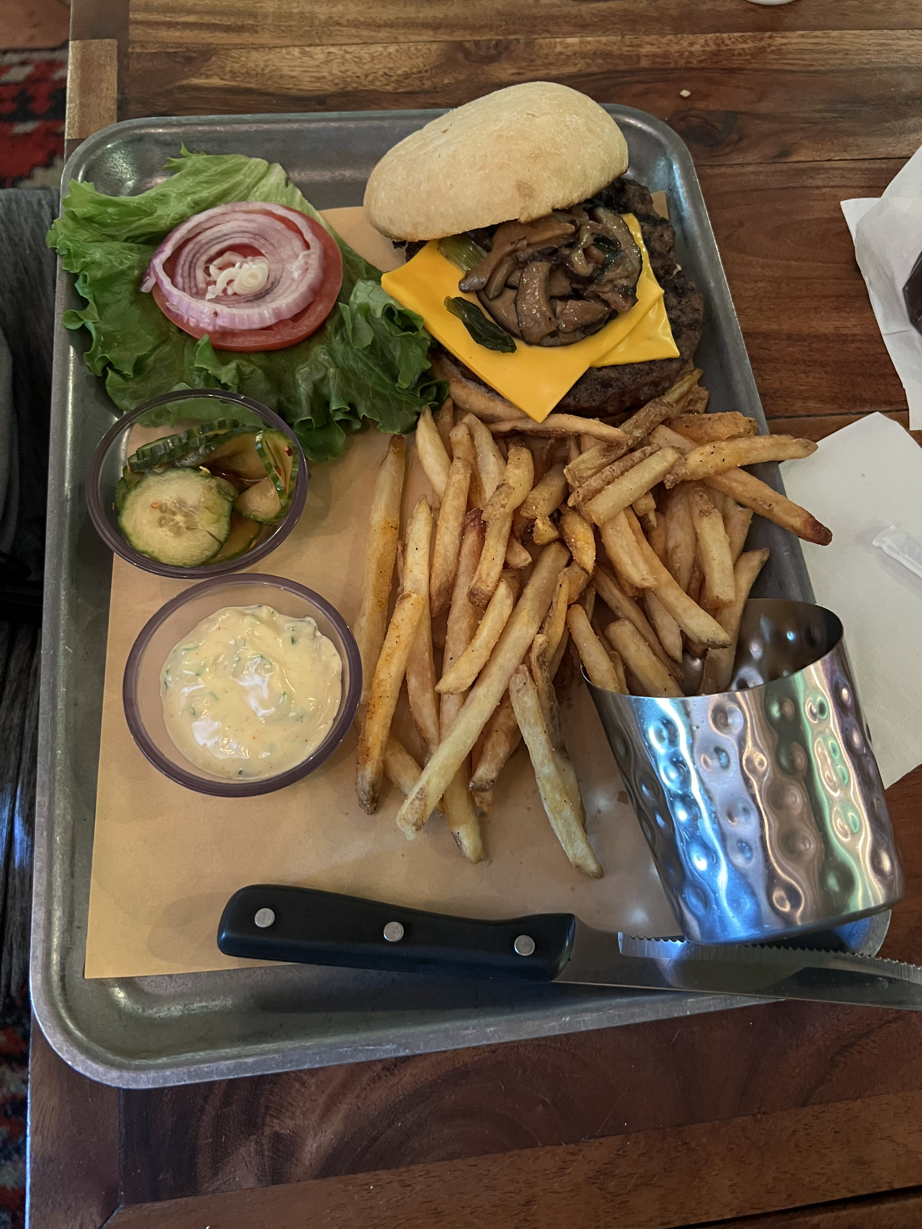 Kobe Beef Burger – 10 oz. grilled American Kobe Beef Burger topped with choice of Shitake Mushroom and Scallion Compote (his choice) or Asian slaw and served with Sesame-Soy Mayonnaise and Crispy French Fries – $24.99 (American cheese added for $.99)