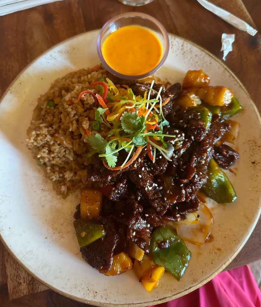 Korean Beef – Wok-fried Beef, Peppers, Onions, and Pineapple with Korean BBQ Sauce $23.99 (served with Chicken Fried Rice for an extra $3.99). She also requested a side of Yum Yum sauce.