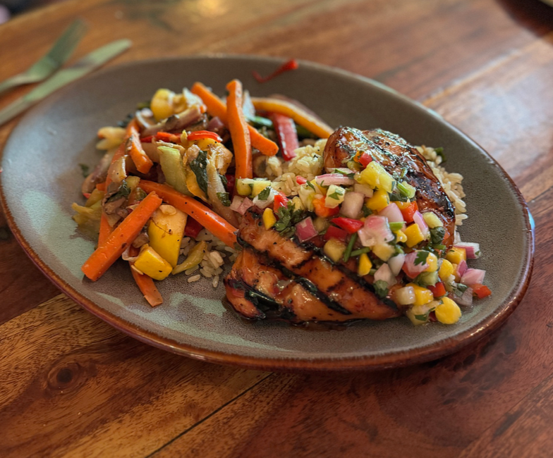 Teriyaki Chicken – Marinated All-Natural Chicken Breast with a Teriyaki Glaze, topped with Pineapple Mango Salsa and served with Stir-fried Vegetables and Coconut-Ginger Rice – $25.99