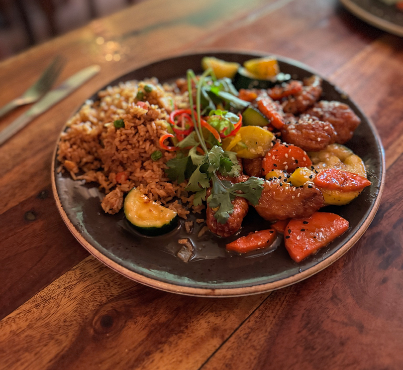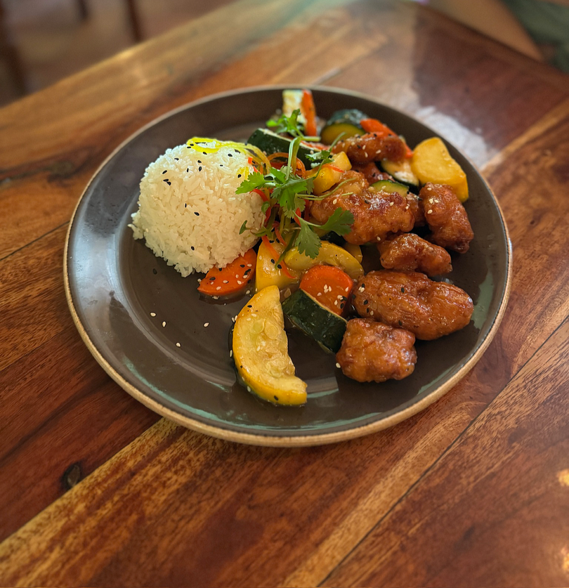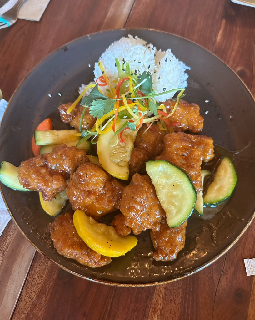 Honey Chicken – Tempura Chicken and stir-fried vegetables tossed in honey sauce, served with a choice of Jasmine (what they both chose) or brown rice – $22.99