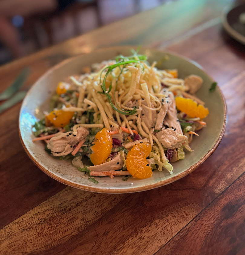 Chop Chop Chicken Salad – Chopped Romaine Lettuce, Red and Napa Cabbage, Carrots, and Marinated Grilled Chicken tossed in Miso Sesame Dressing and topped with Mandarin Orange Slices and Crispy Wontons – $20.99