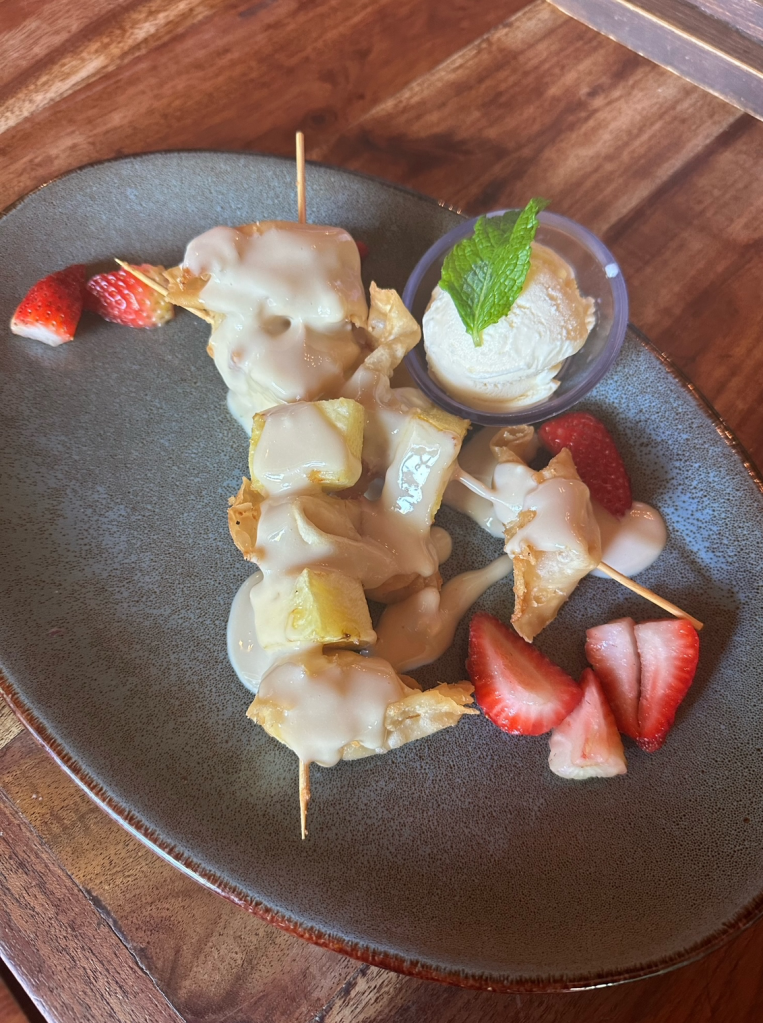 Fried Wontons – Skewers of Fresh Pineapple and Cream Cheese-filled Wontons topped with Honey-Vanilla Sauce and garnished with Strawberry pieces. Served with Vanilla Ice Cream – $13.99